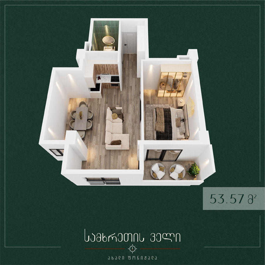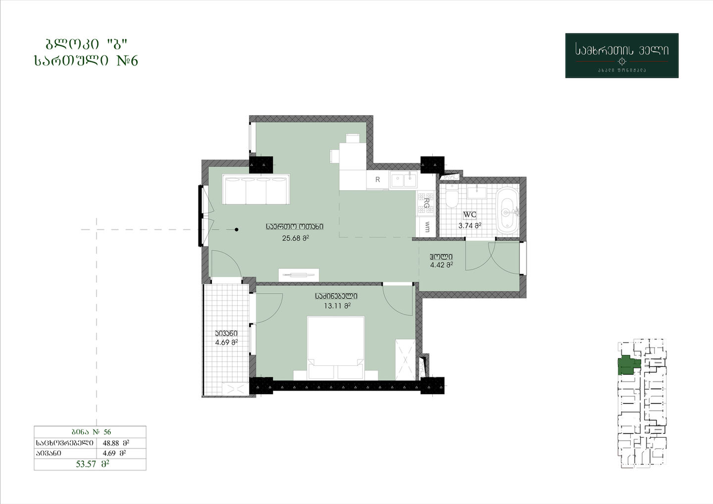 2 .მისაღები ოთახი/სტუდიო: 25.68 კვ.მ