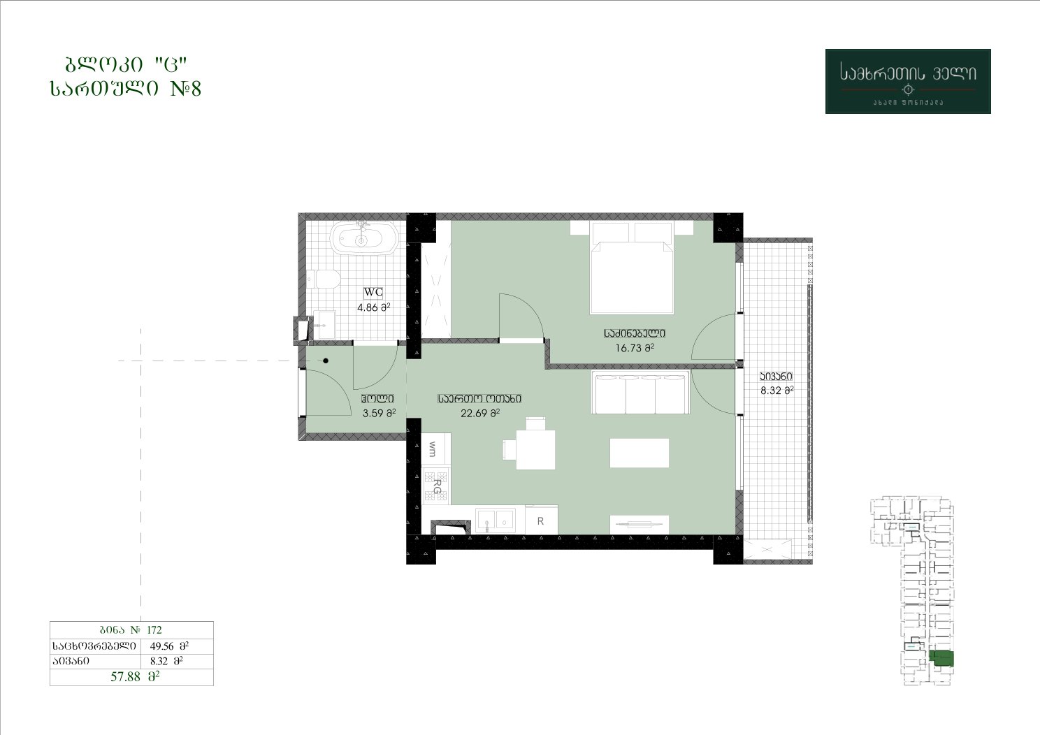 2.მისაღები ოთახი/სტუდიო: 22.69 კვ.მ
