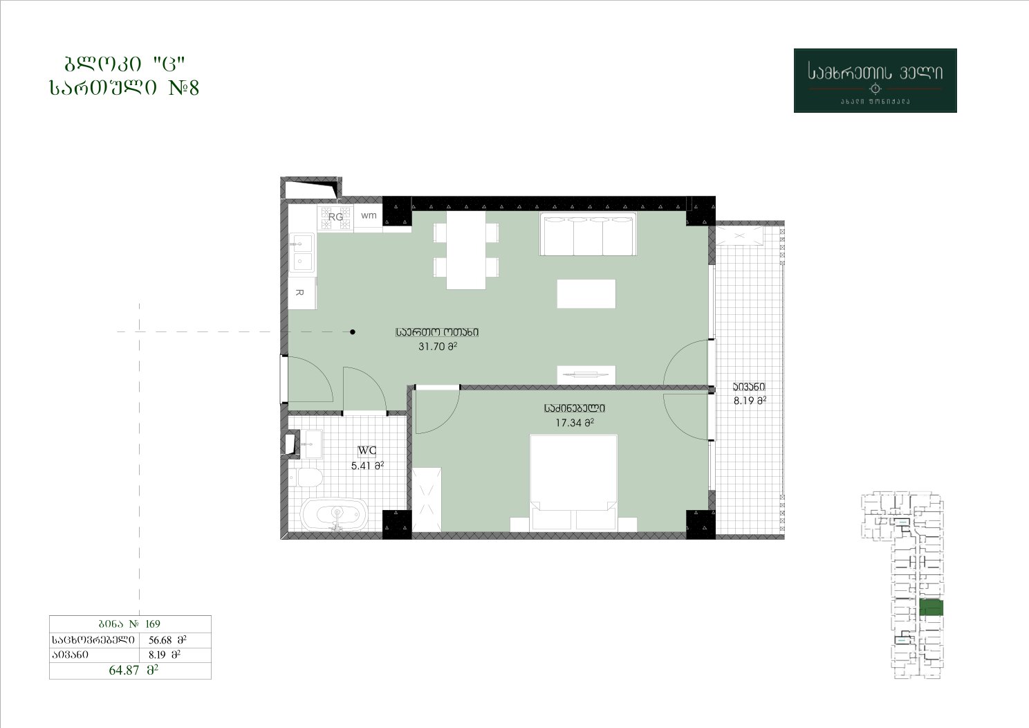 2.მისაღები ოთახი/სტუდიო: 31.70 კვ.მ