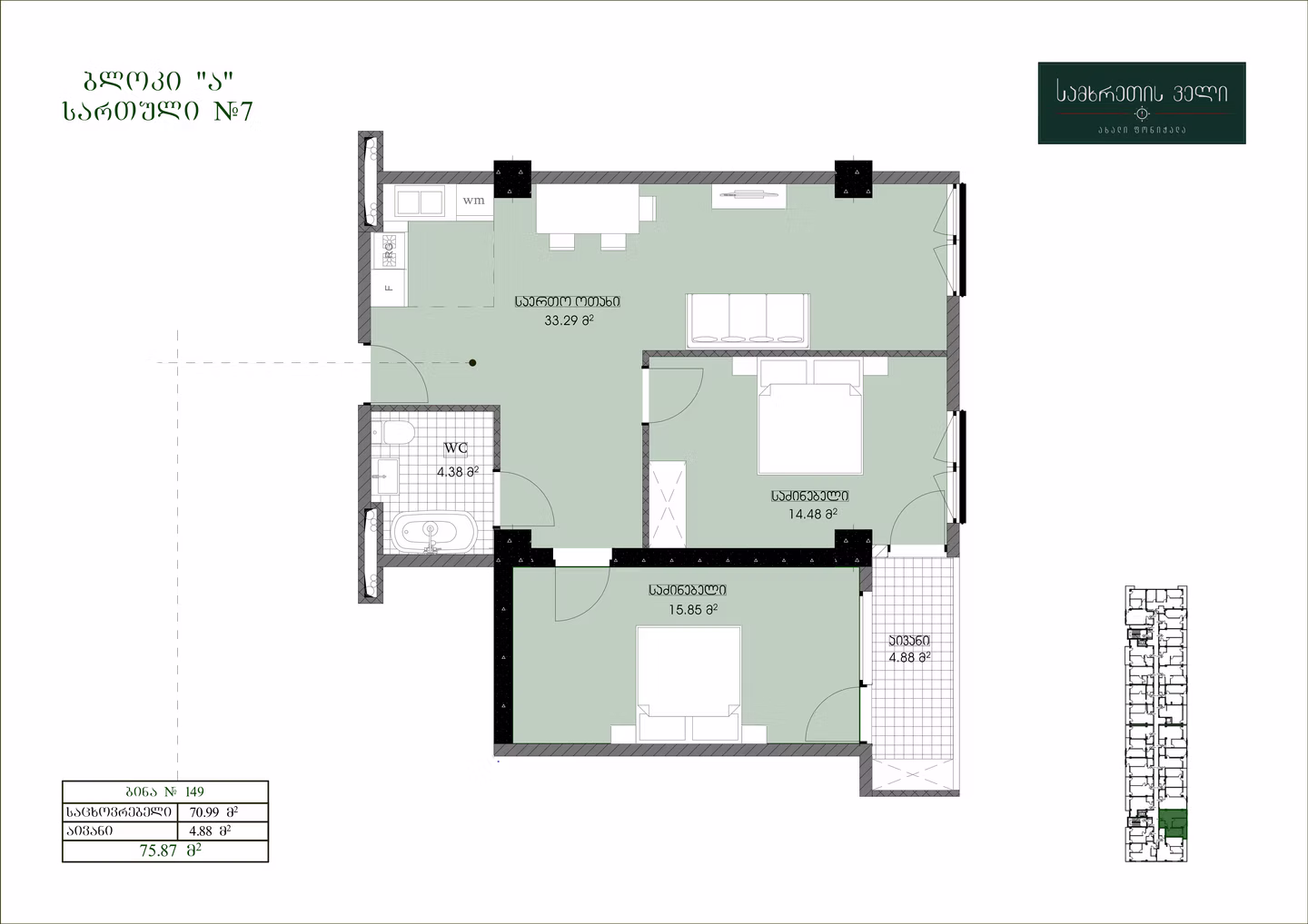 3.მისაღები ოთახი/სტუდიო: 33.29 კვ.მ