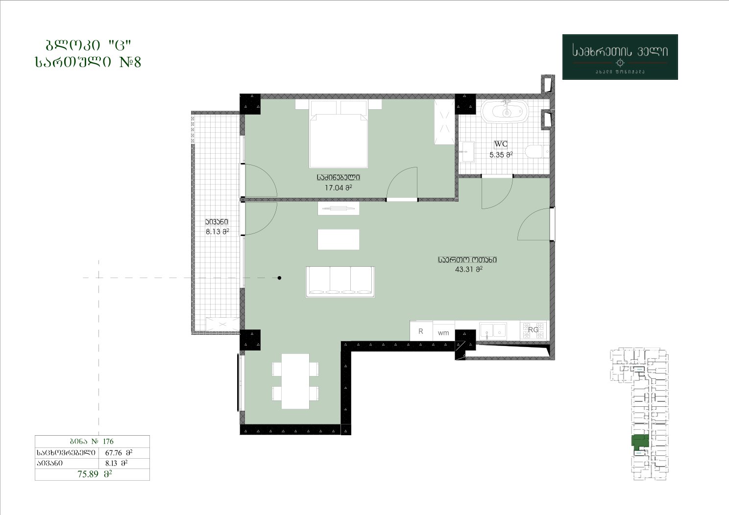 2.მისაღები ოთახი/სტუდიო: 43.31 კვ.მ