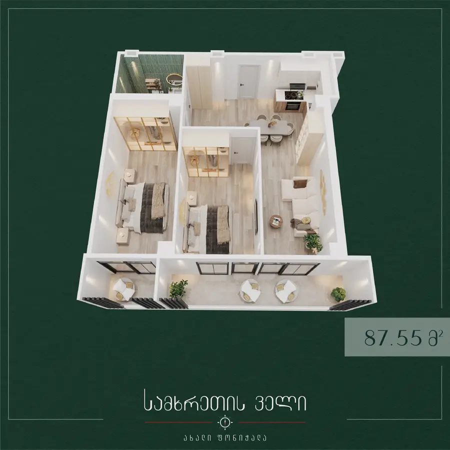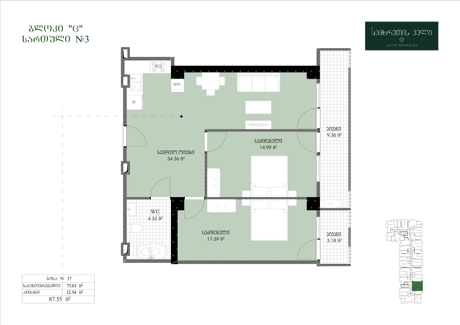3.მისაღები ოთახი/სტუდიო: 34.36 კვ.მ